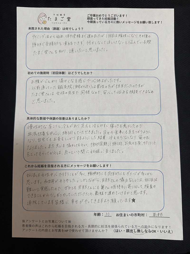 少しでも不妊治療の成功率を高めたいと考え、情報収集をしていく中でたまご堂を見つけ通うことにしました。