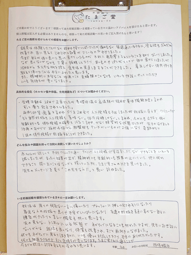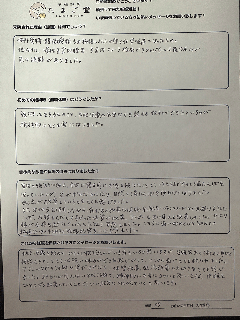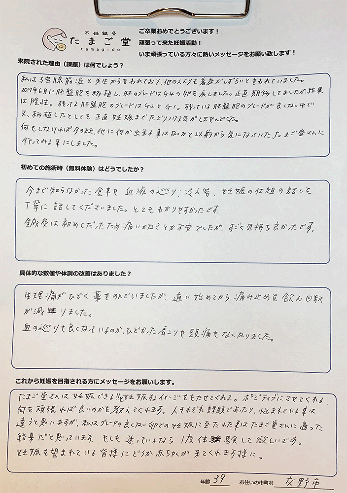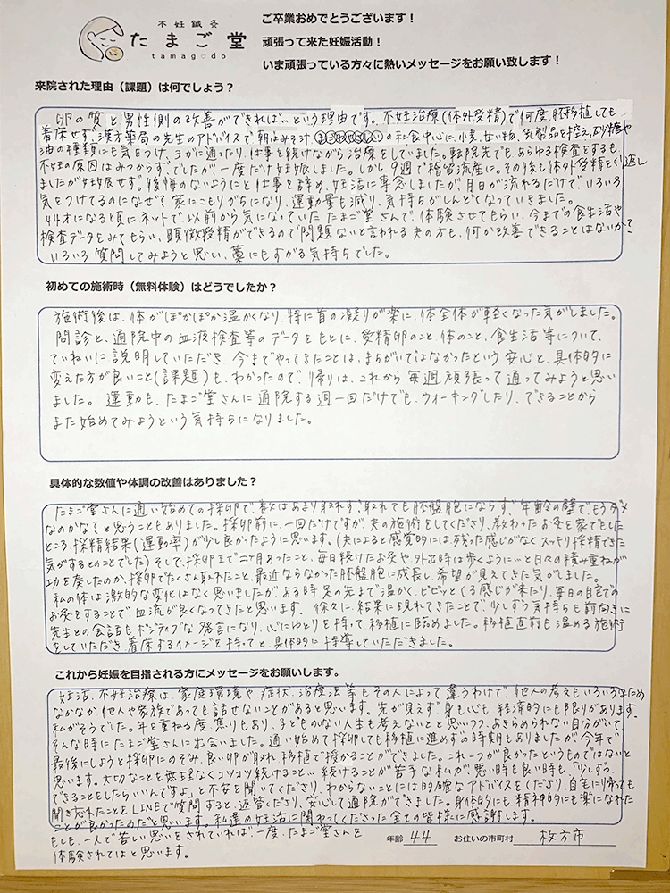 体外受精で3回移植しましたが全くかすりもせず。保険治療での移植が残り3回な事、年齢の事もあり、やれることはやりたい、何かできる事はないかなと思った時に、たまご堂さんをネットで知り来院しました。