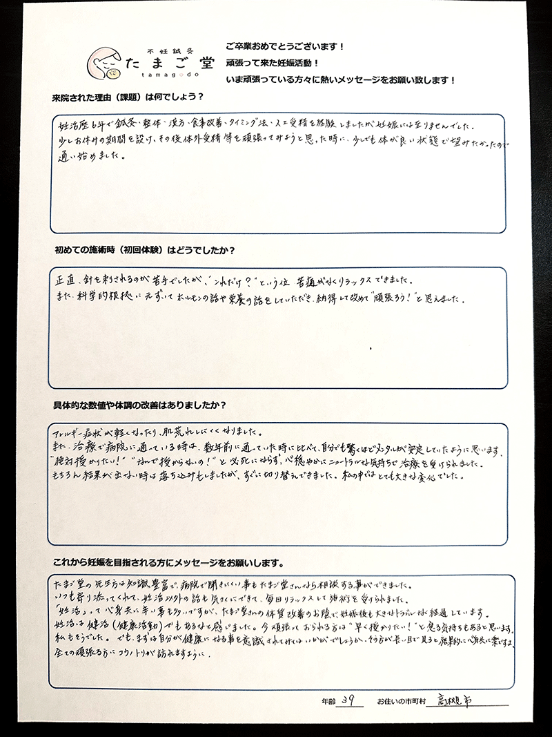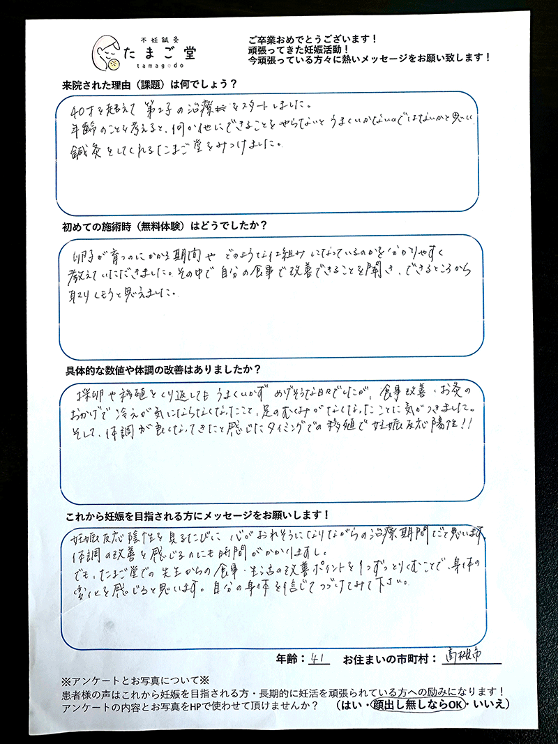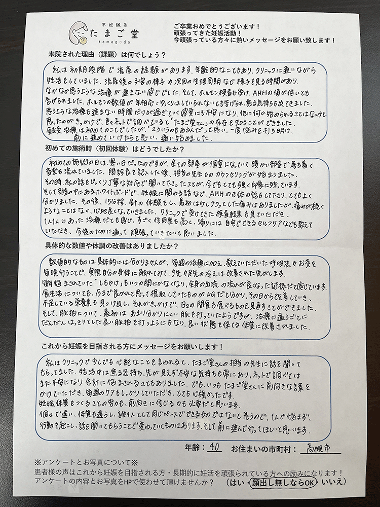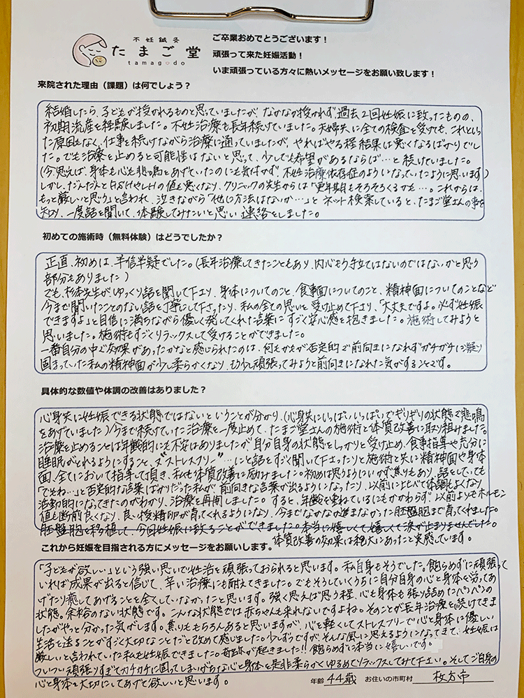 体外受精で3回移植しましたが全くかすりもせず。保険治療での移植が残り3回な事、年齢の事もあり、やれることはやりたい、何かできる事はないかなと思った時に、たまご堂さんをネットで知り来院しました。