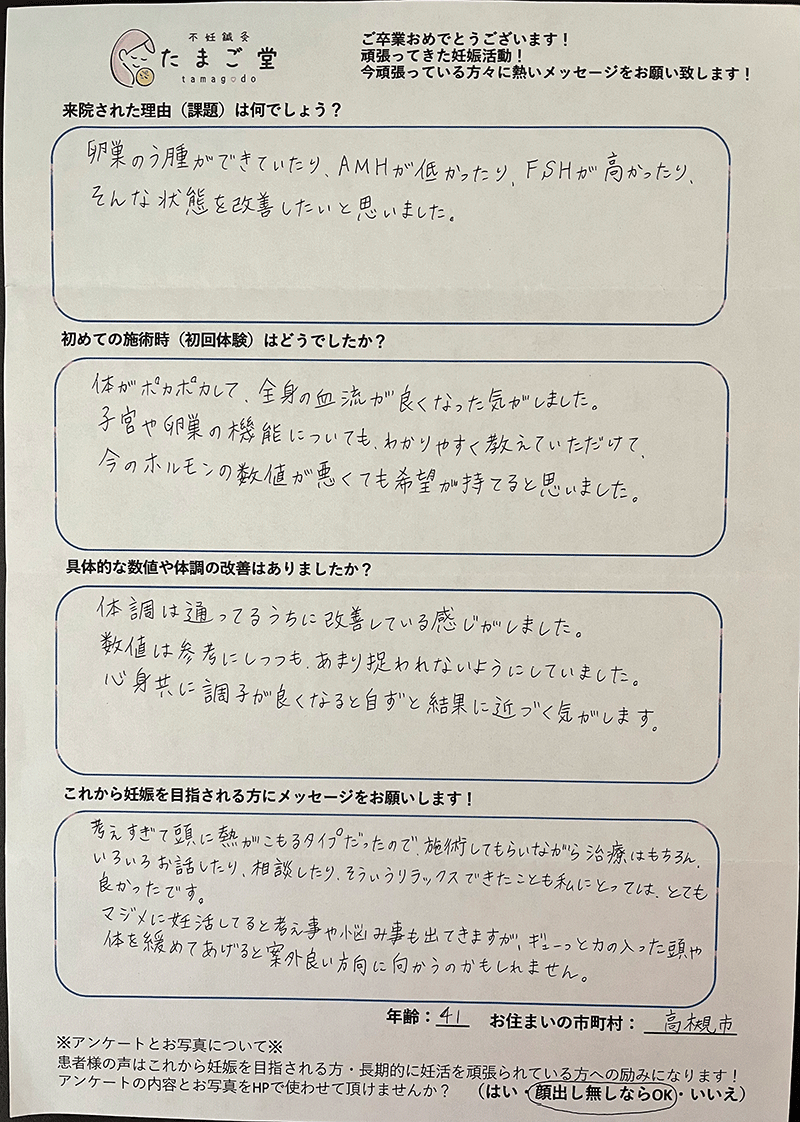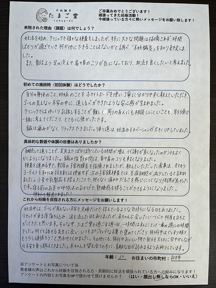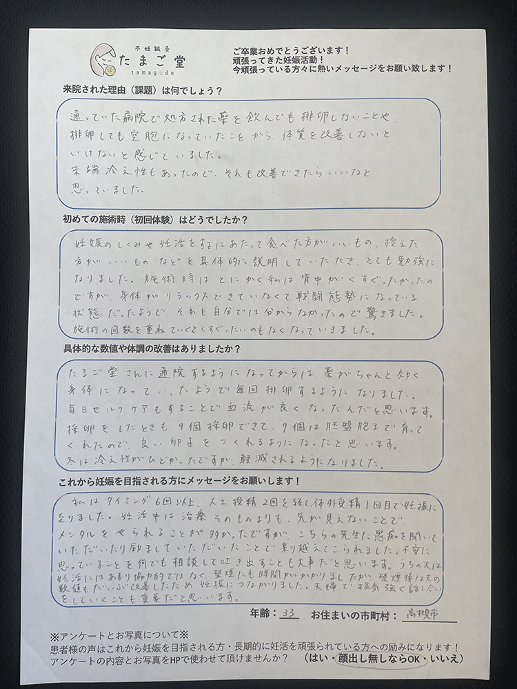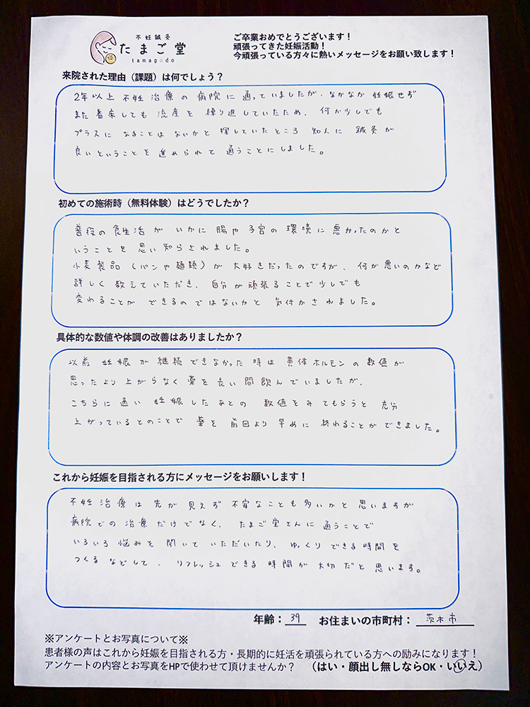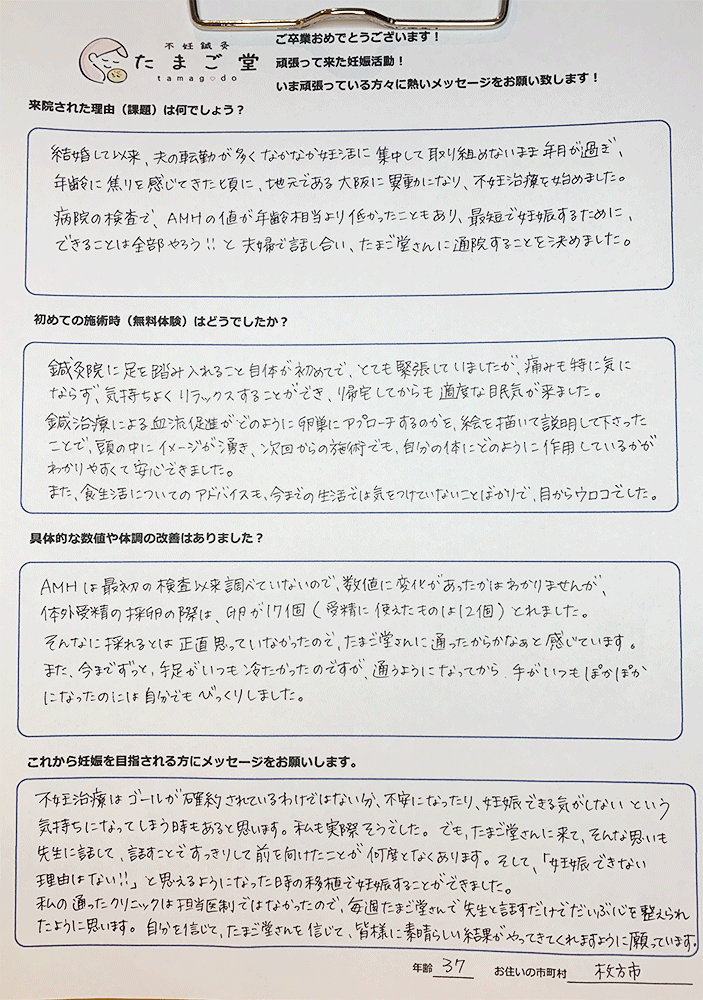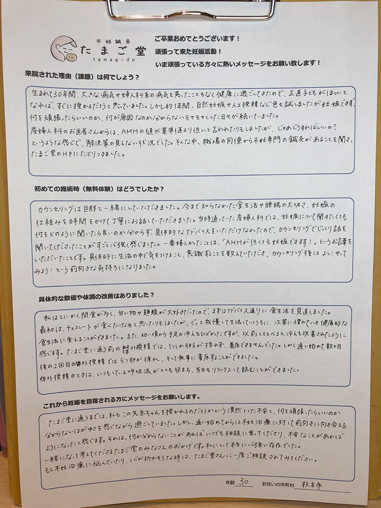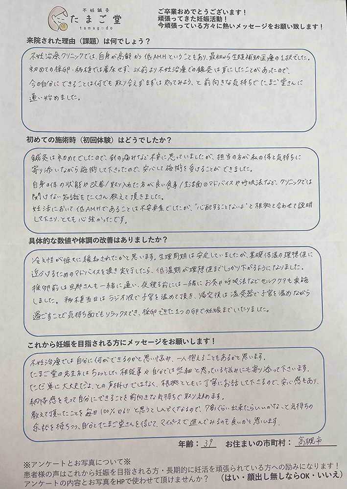 産婦人科のお医者さんからは、AMHの値が基準値より低いと言われたりもしましたが、じゃあどうすればいいの?という感じで、解決策の見えない状況でした。そんな中、職場の同僚から不妊専門の鍼灸があることを聞き、たまご堂のHPにたどりつきました。