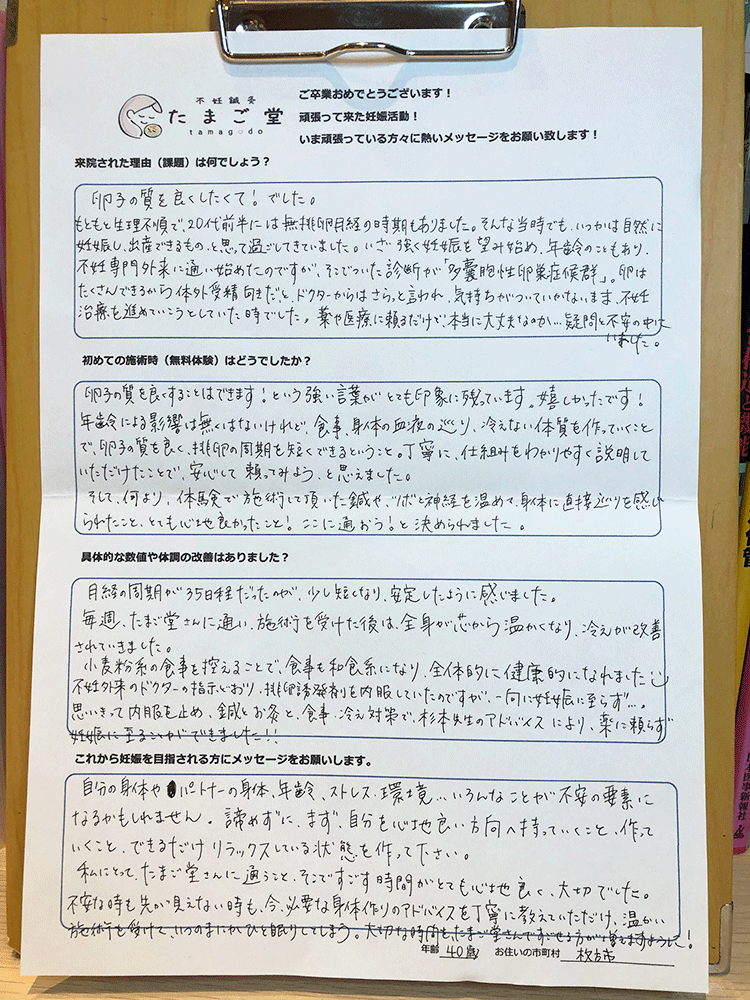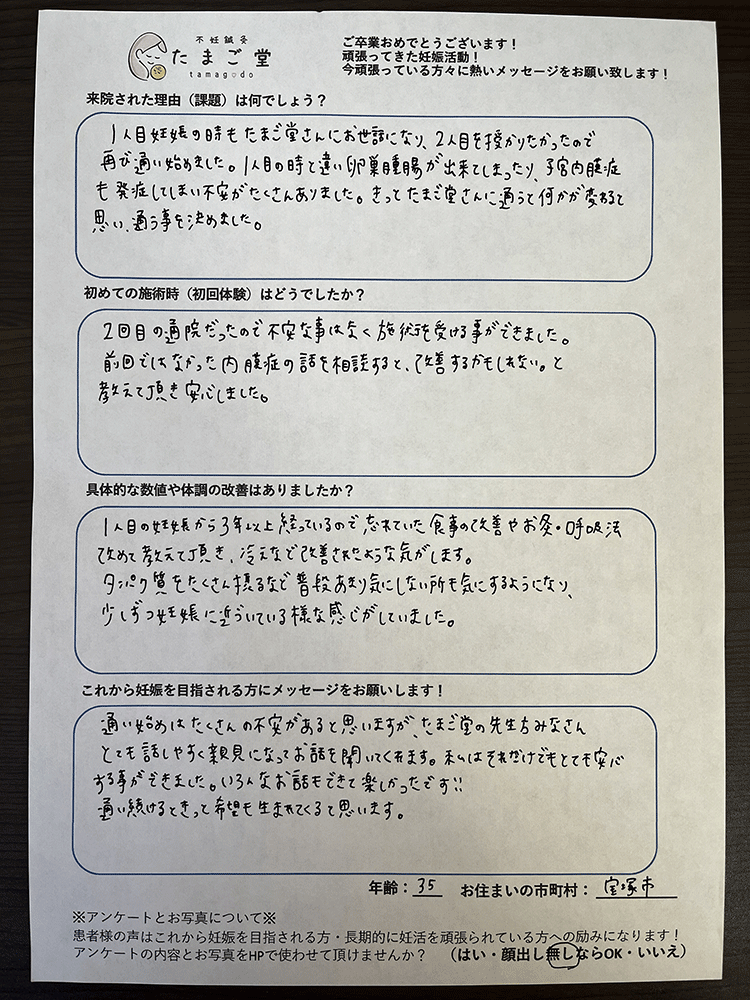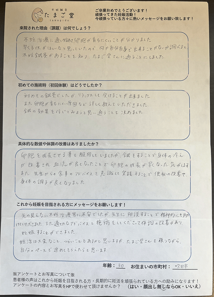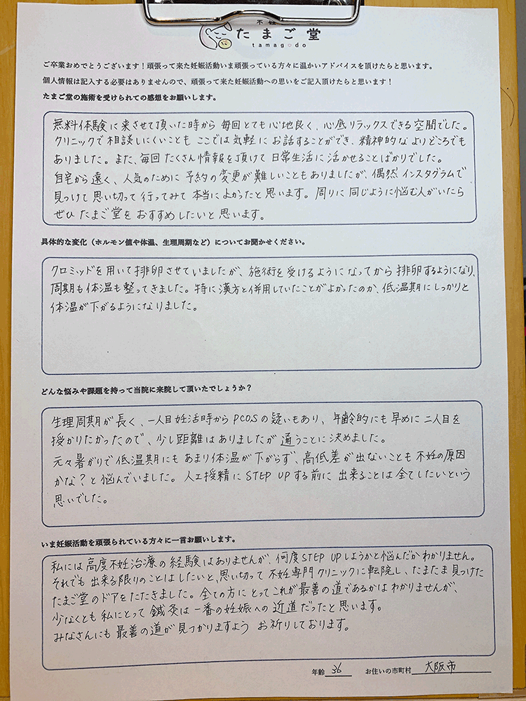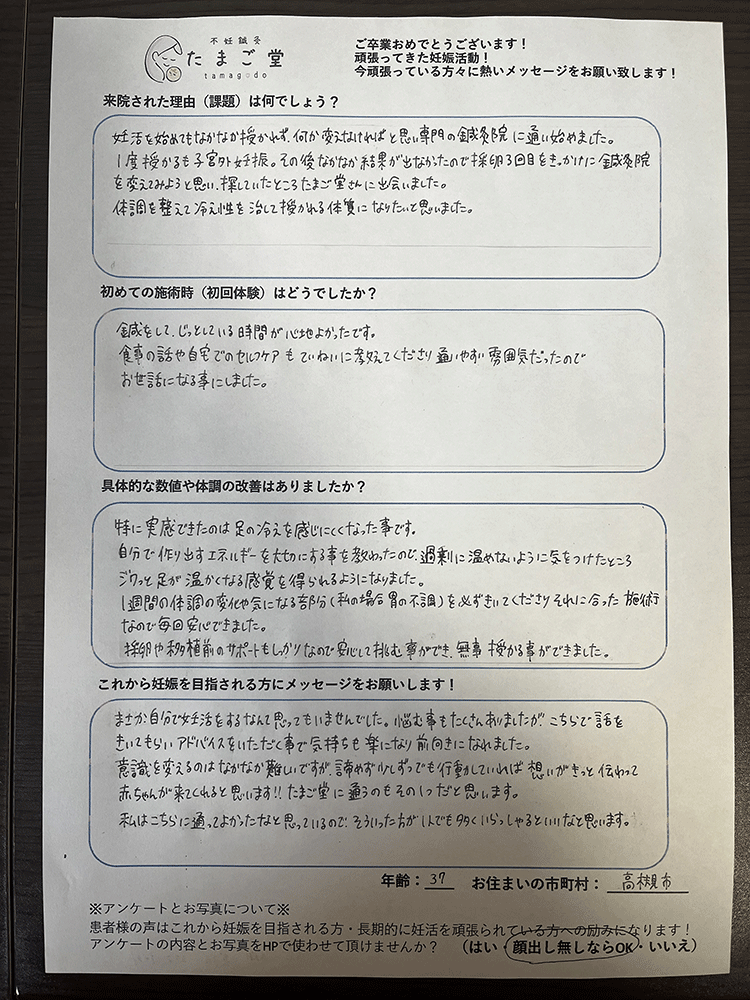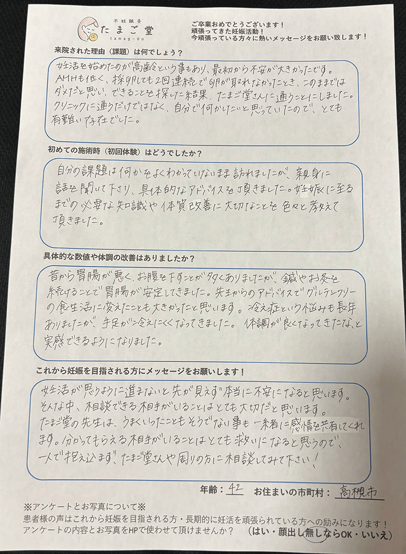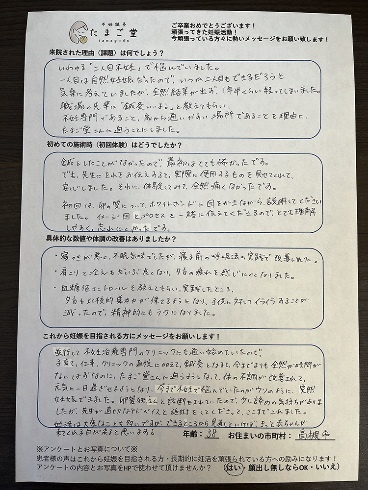 産婦人科のお医者さんからは、AMHの値が基準値より低いと言われたりもしましたが、じゃあどうすればいいの?という感じで、解決策の見えない状況でした。そんな中、職場の同僚から不妊専門の鍼灸があることを聞き、たまご堂のHPにたどりつきました。