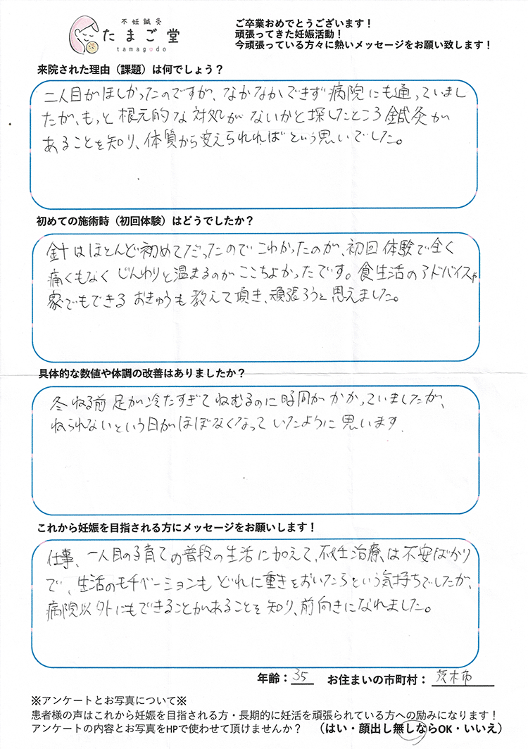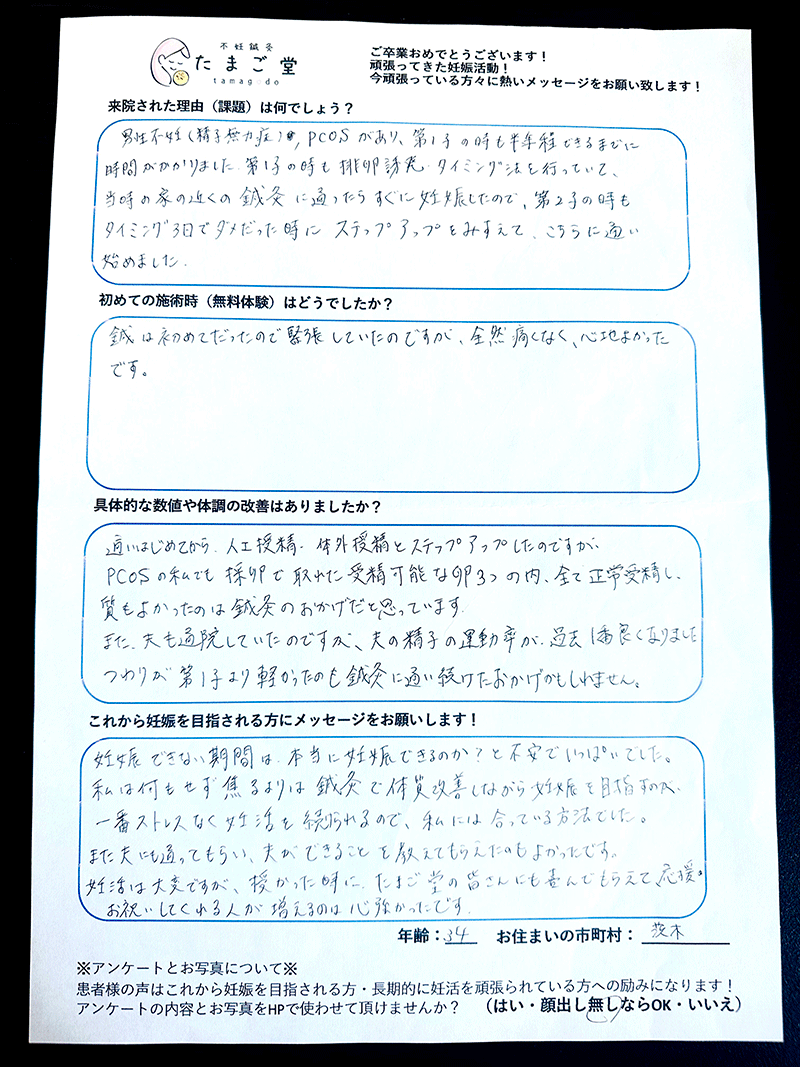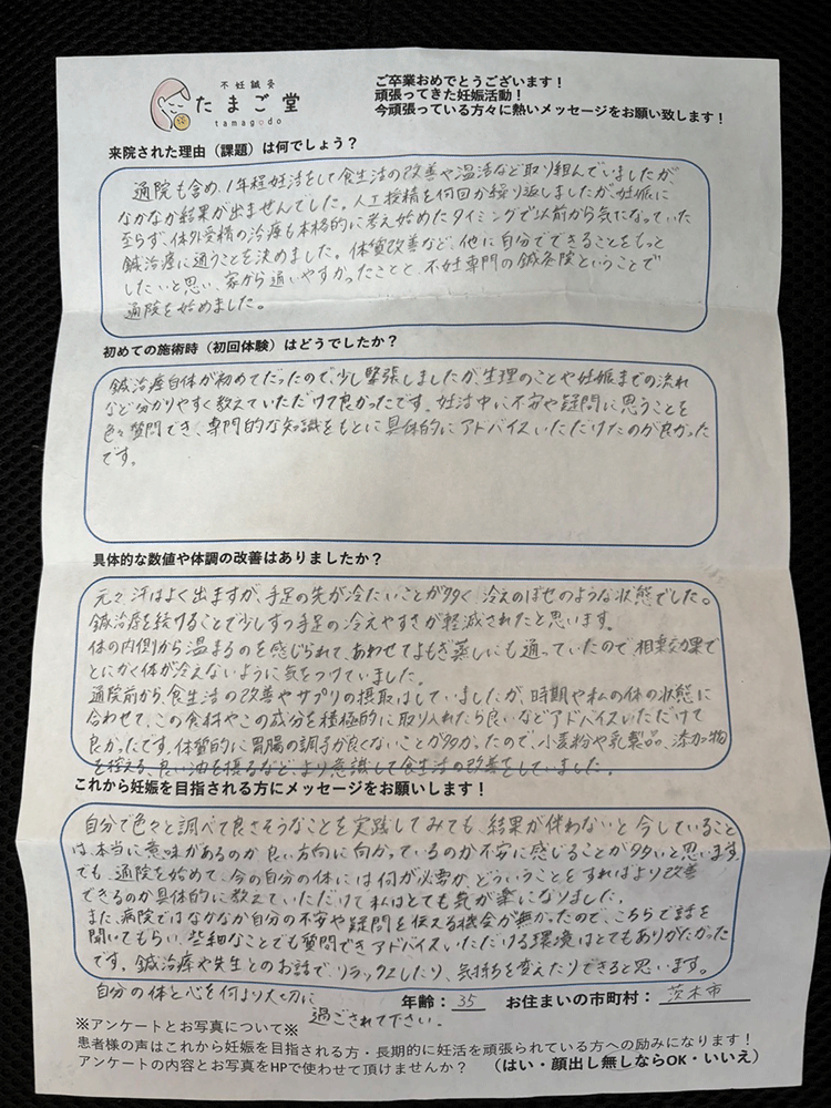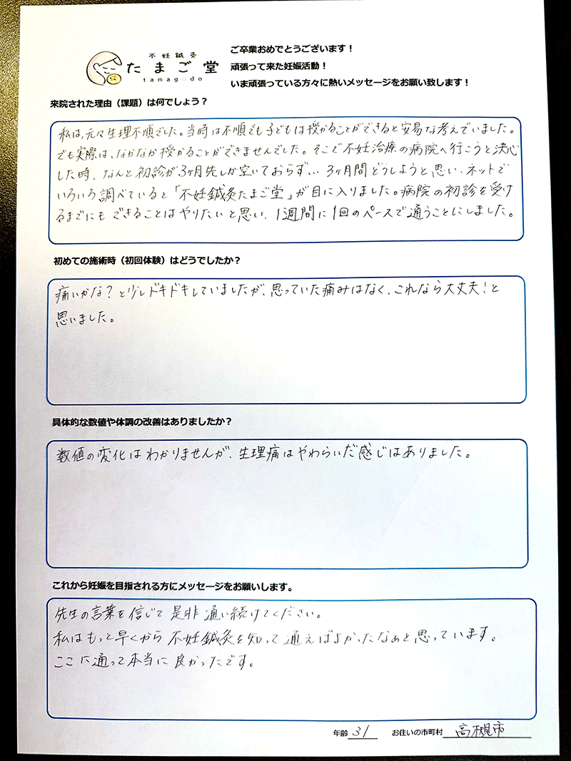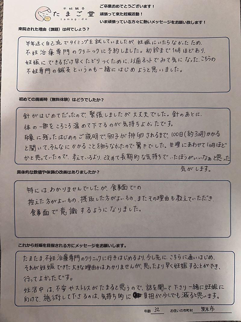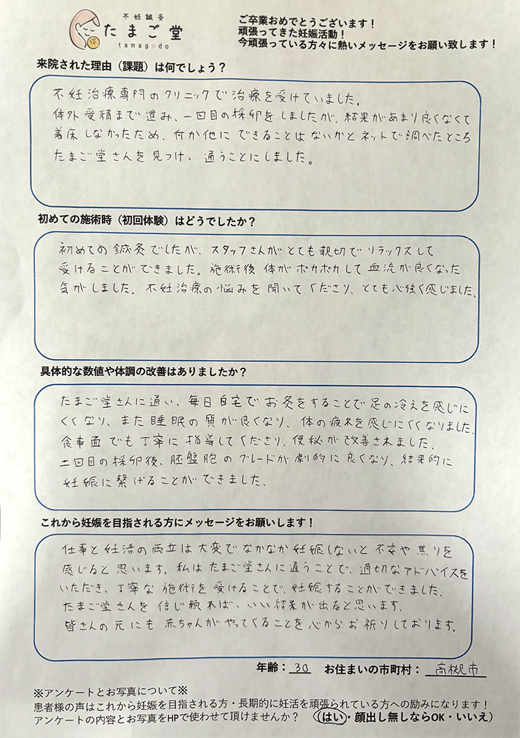 産婦人科のお医者さんからは、AMHの値が基準値より低いと言われたりもしましたが、じゃあどうすればいいの?という感じで、解決策の見えない状況でした。そんな中、職場の同僚から不妊専門の鍼灸があることを聞き、たまご堂のHPにたどりつきました。