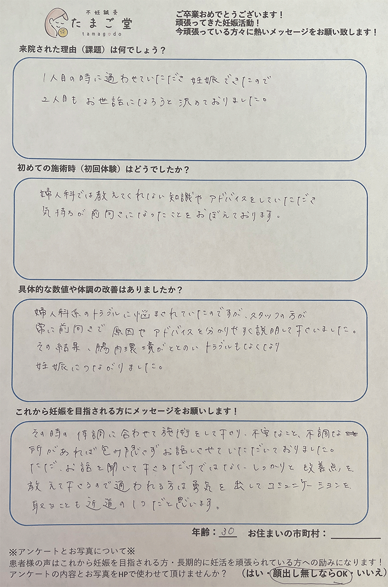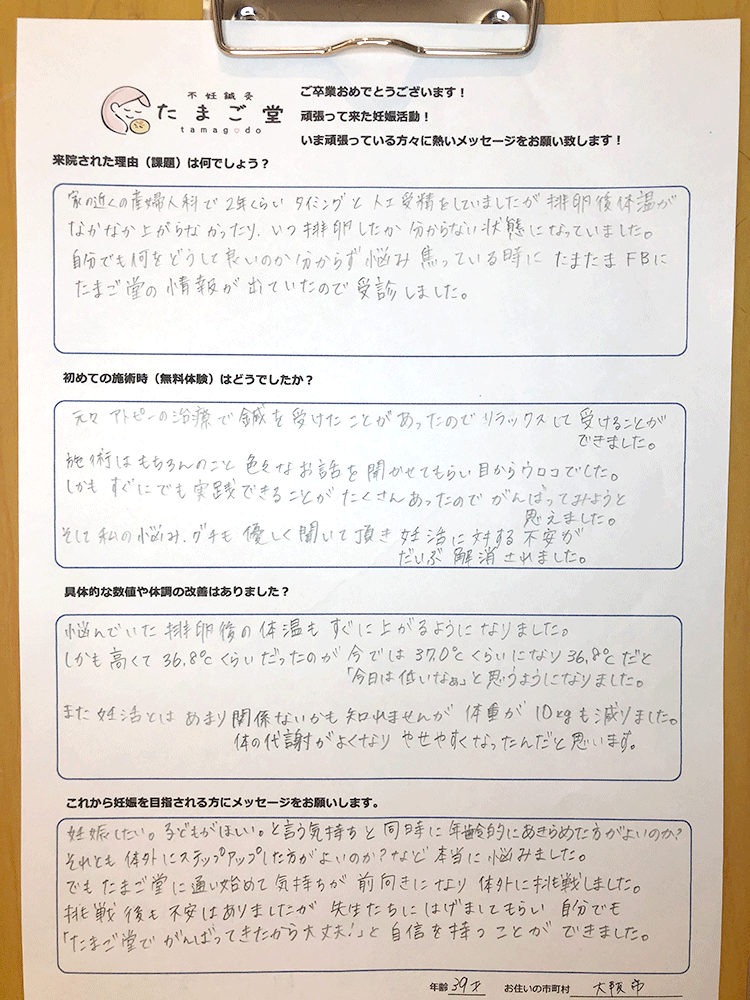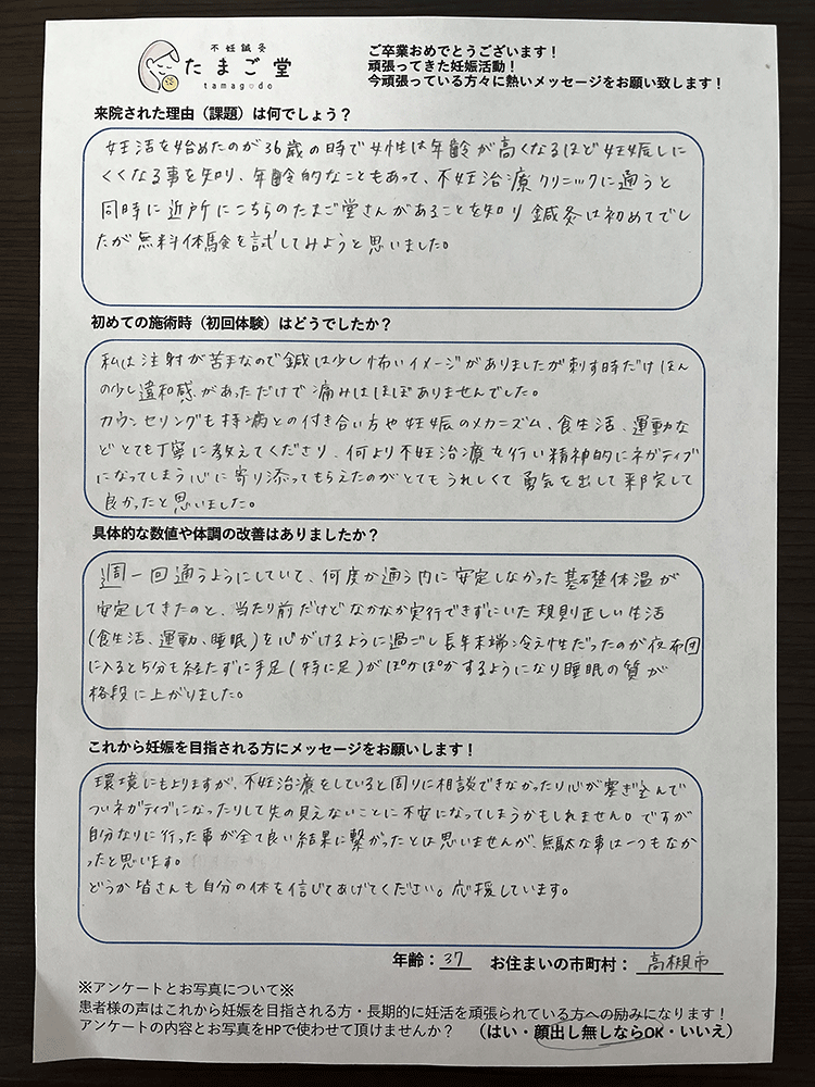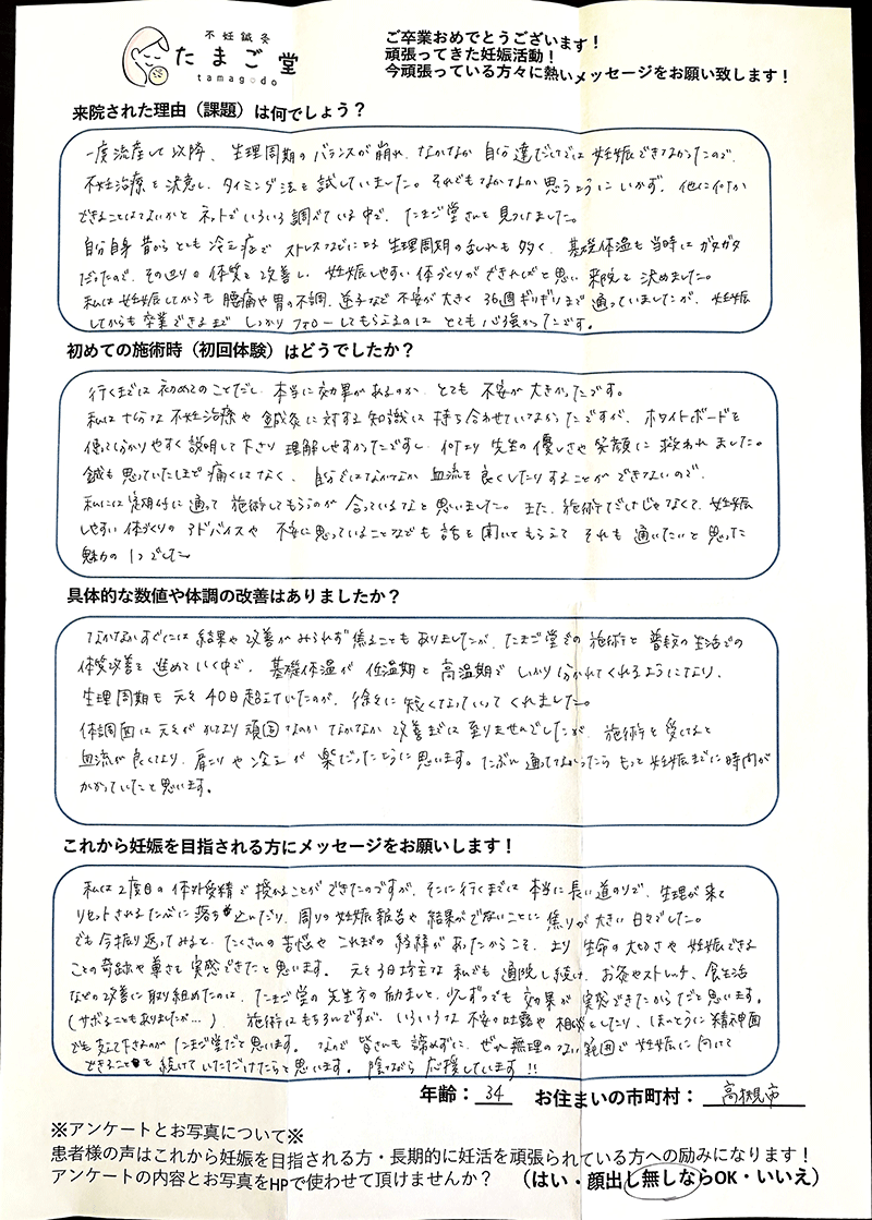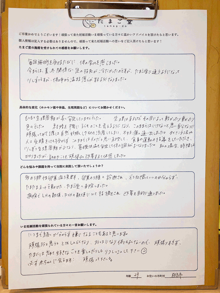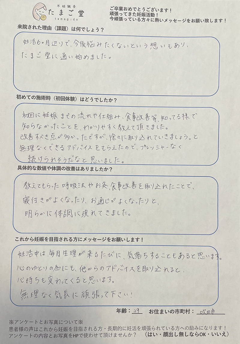 たまご堂さんでたくさんの知識をいただき、いつも一緒に明るく伴走してくださったからこそ、ズボラな私でも体質改善ができ、妊娠に結びつきました。