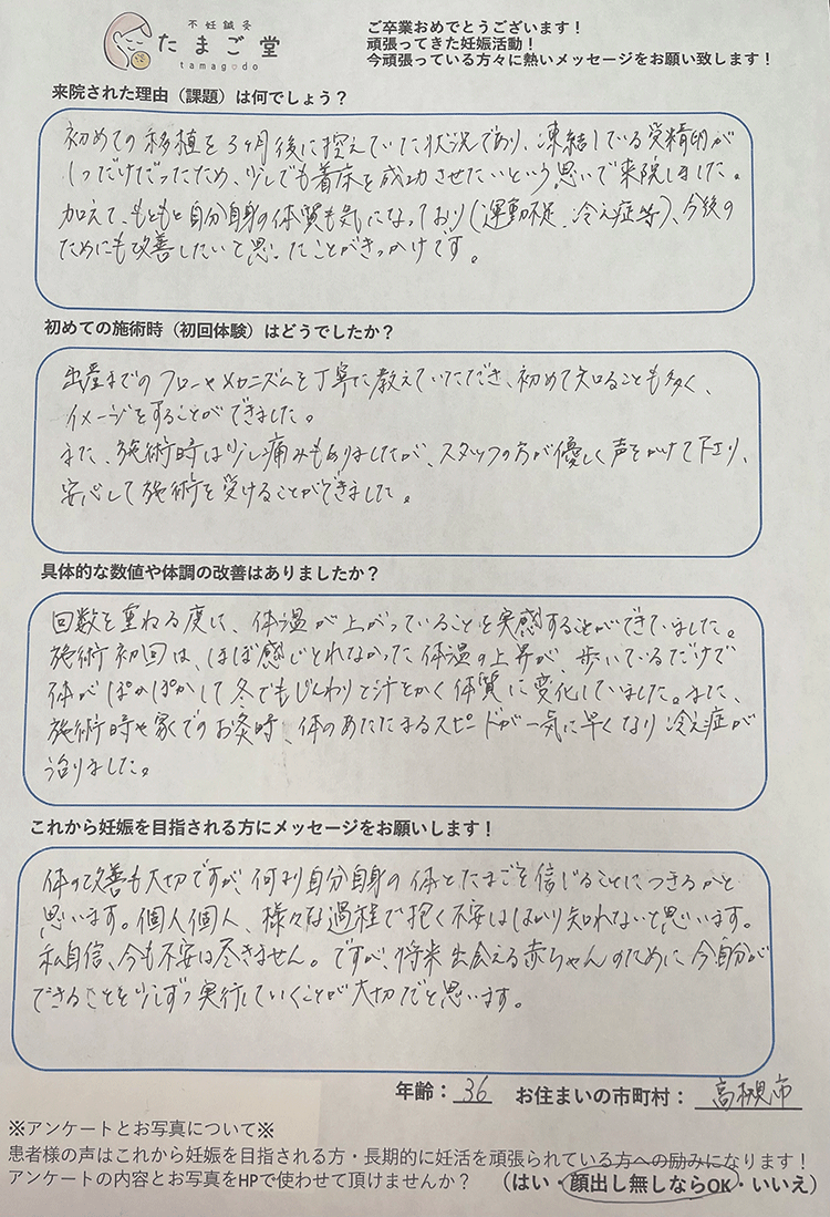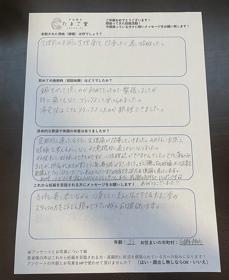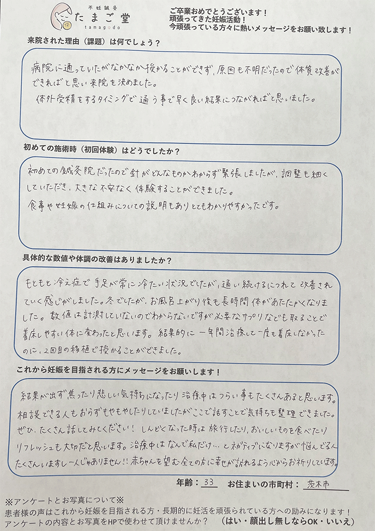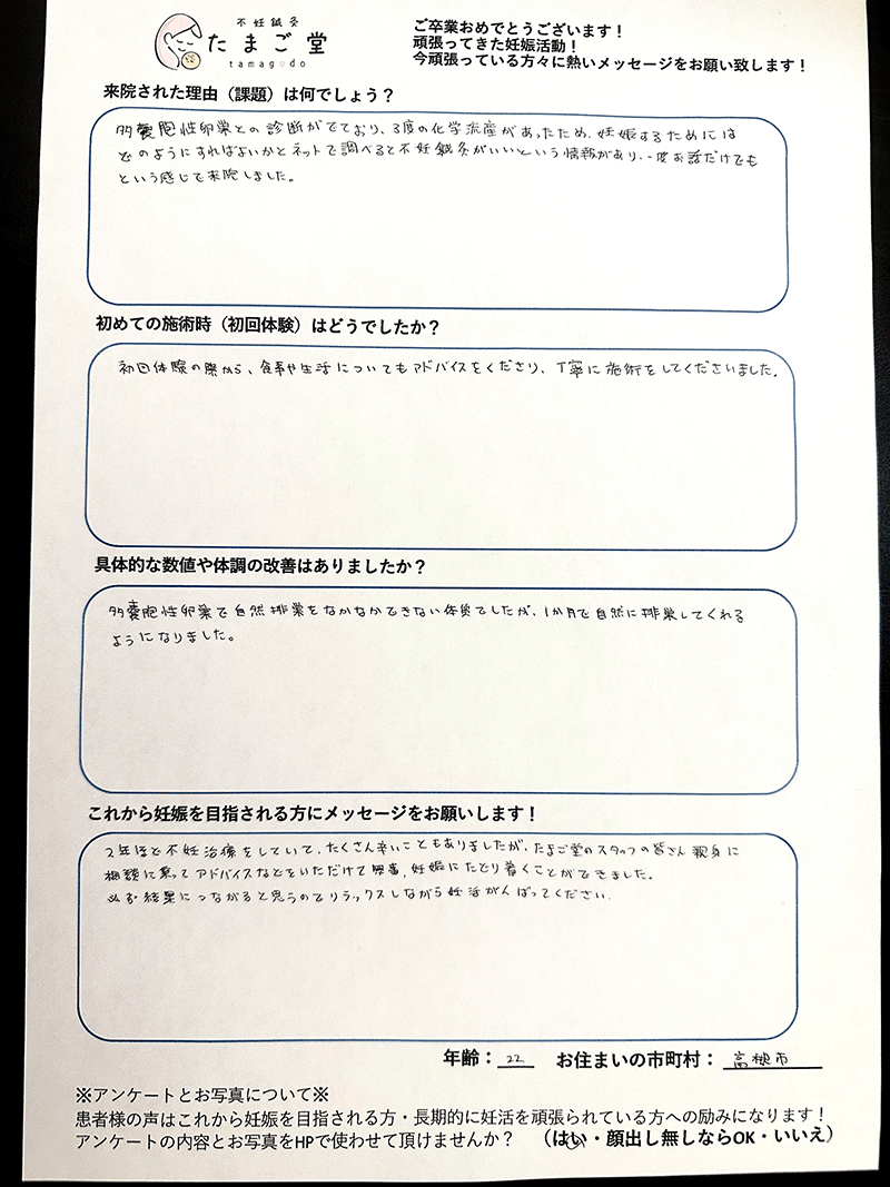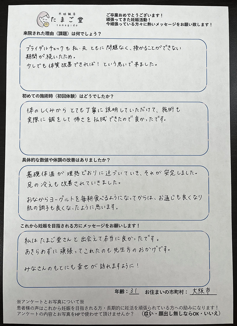 たまご堂さんでたくさんの知識をいただき、いつも一緒に明るく伴走してくださったからこそ、ズボラな私でも体質改善ができ、妊娠に結びつきました。