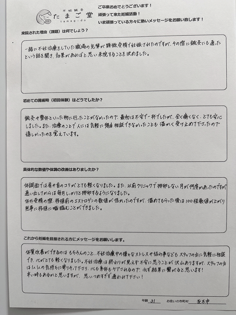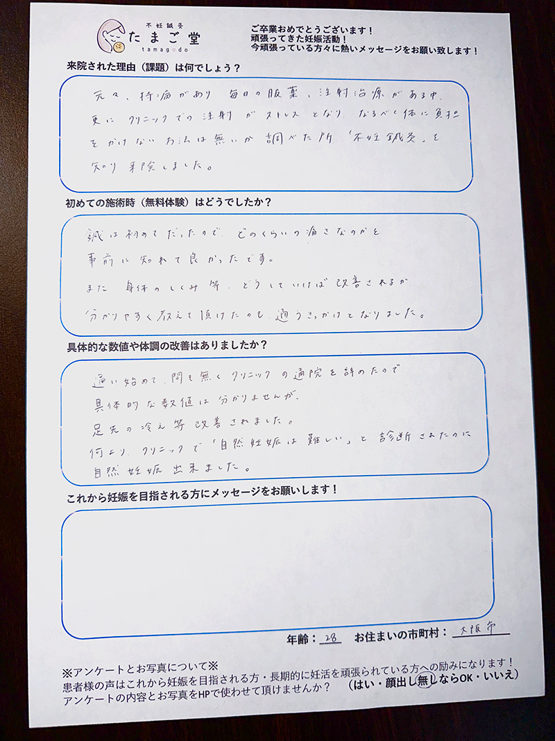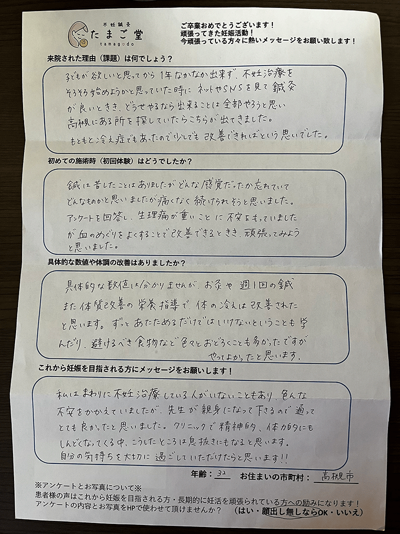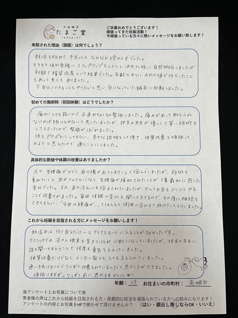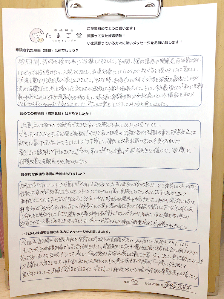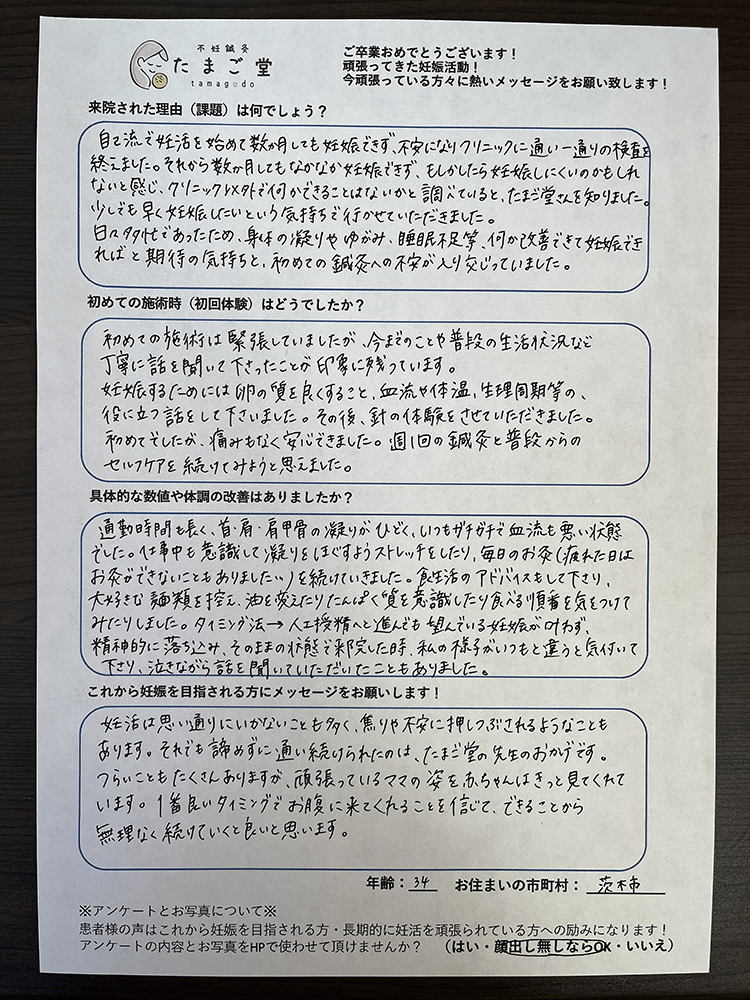 約5年間、我が子を授かる為に治療してきました。その間、子宮内膜症や腹膜炎、両卵管切除などの手術を受けたり、入院をくり返し、私達夫婦にはなかなか我が子を授かるには難しい状況を重なり涙も沢山流してきました。そんな時、夫婦で2019年で妊活も治療も最後にしようと決めて目標をたて、やっと授かった初めての妊娠は子宮外妊娠でした。そして、今年最後なら「私に出来る事は何でもしよう」ともう一度気持ちを持ち直し、妊活に鍼灸を取り入れると良いという情報を知り、以前からFacebookで気になっていた『たまご堂』に行ってみようと思いました。