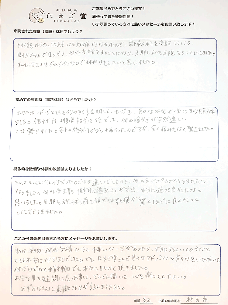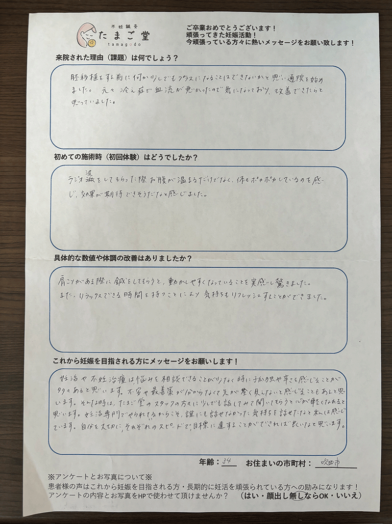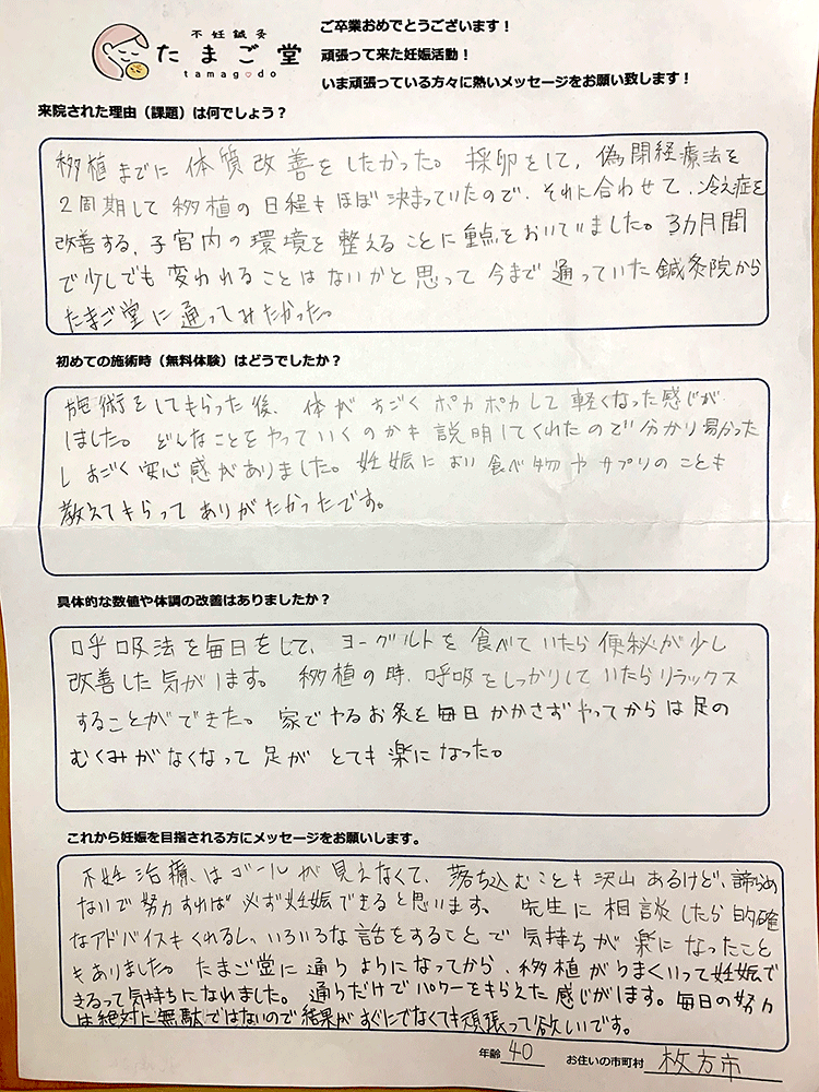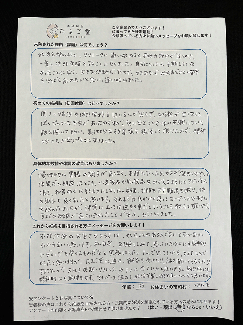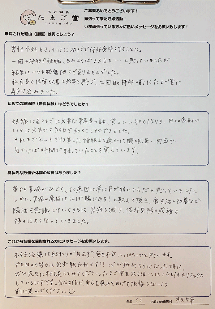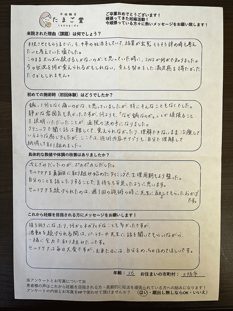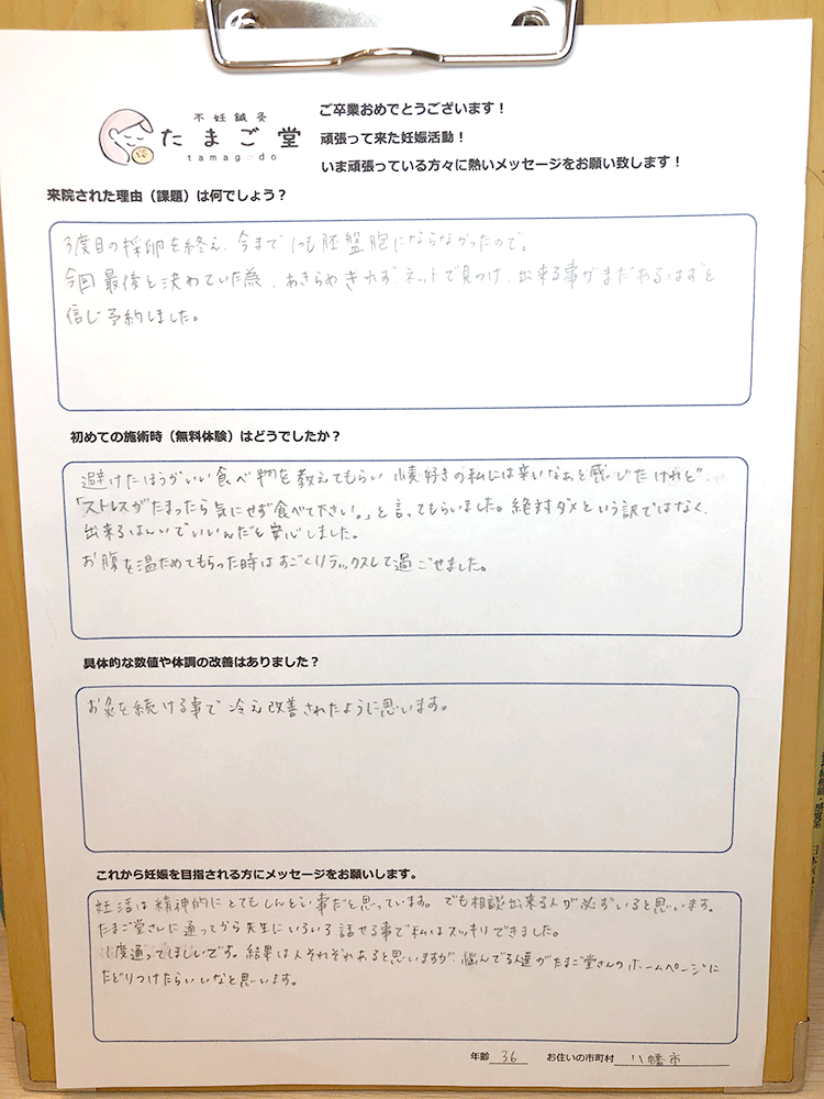 少しでも不妊治療の成功率を高めたいと考え、情報収集をしていく中でたまご堂を見つけ通うことにしました。