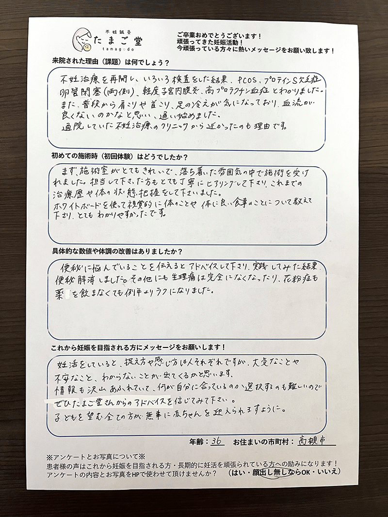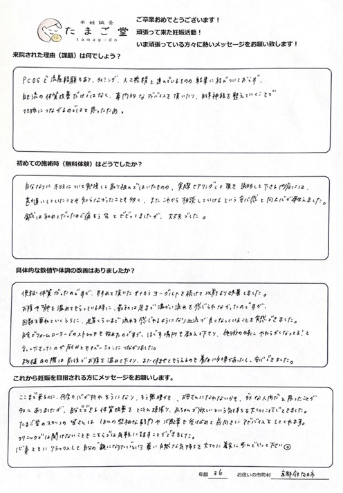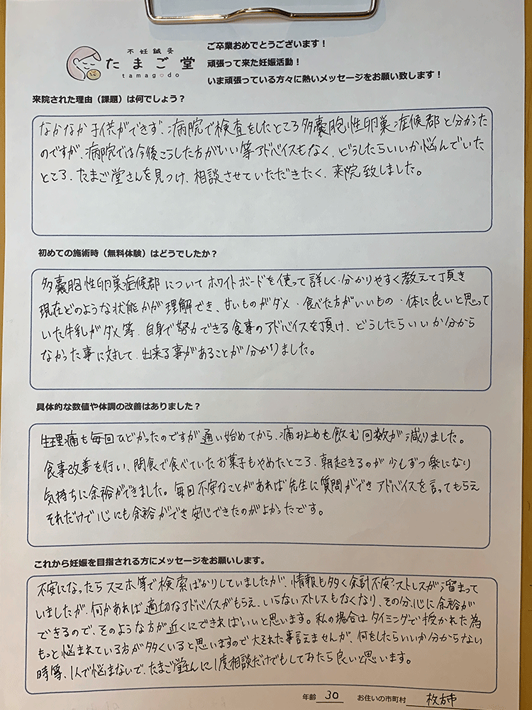 なかなか子供ができず、病院で検査をしたところ多嚢胞性卵巣症候群と分かったのですが、病院では今後どうしたらいい等アドバイスもなく、どうしたらいいか悩んでいたところ、たまご堂さんを見つけ、相談させていただきたく、来院致しました。