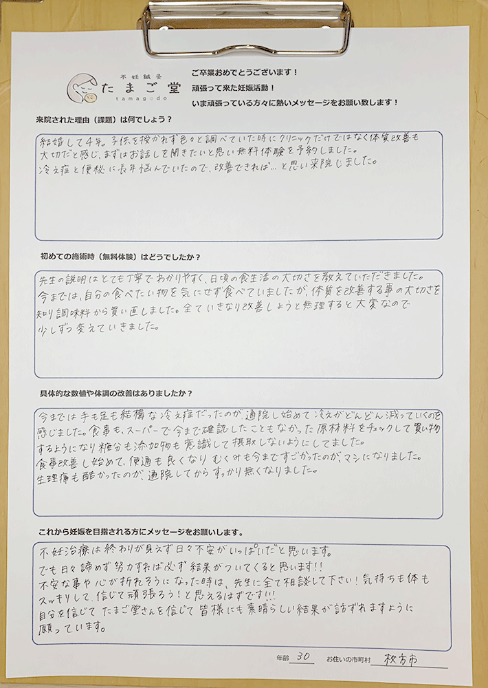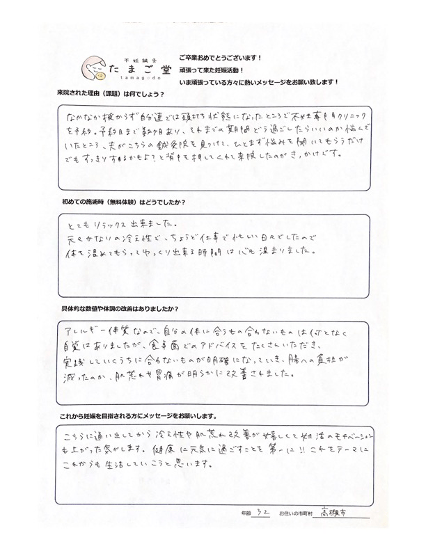 元々冷え性や頭痛、生理痛もあり、体質改善が必要だと感じ、たまご堂さんにお世話になりました。