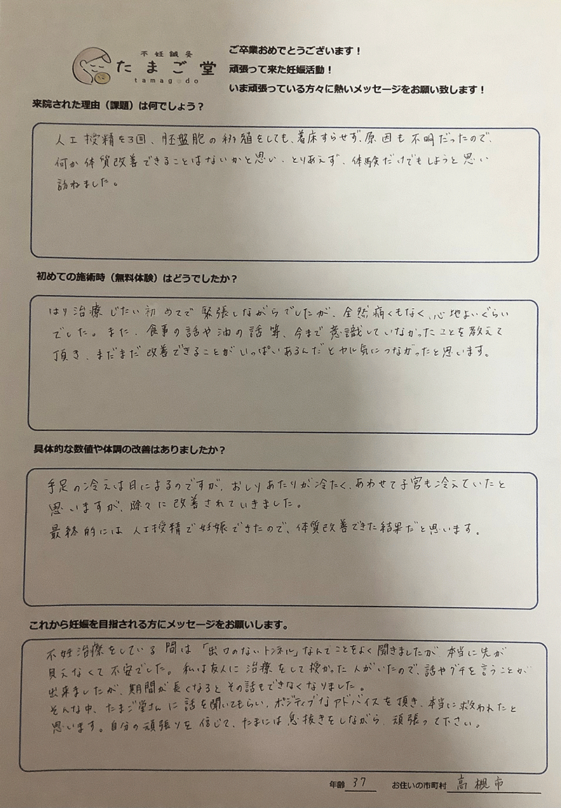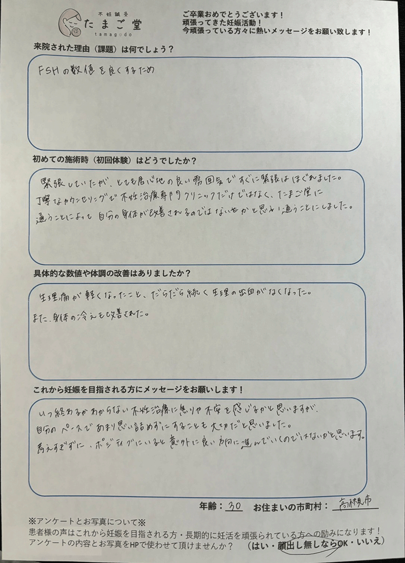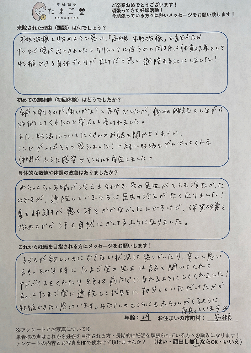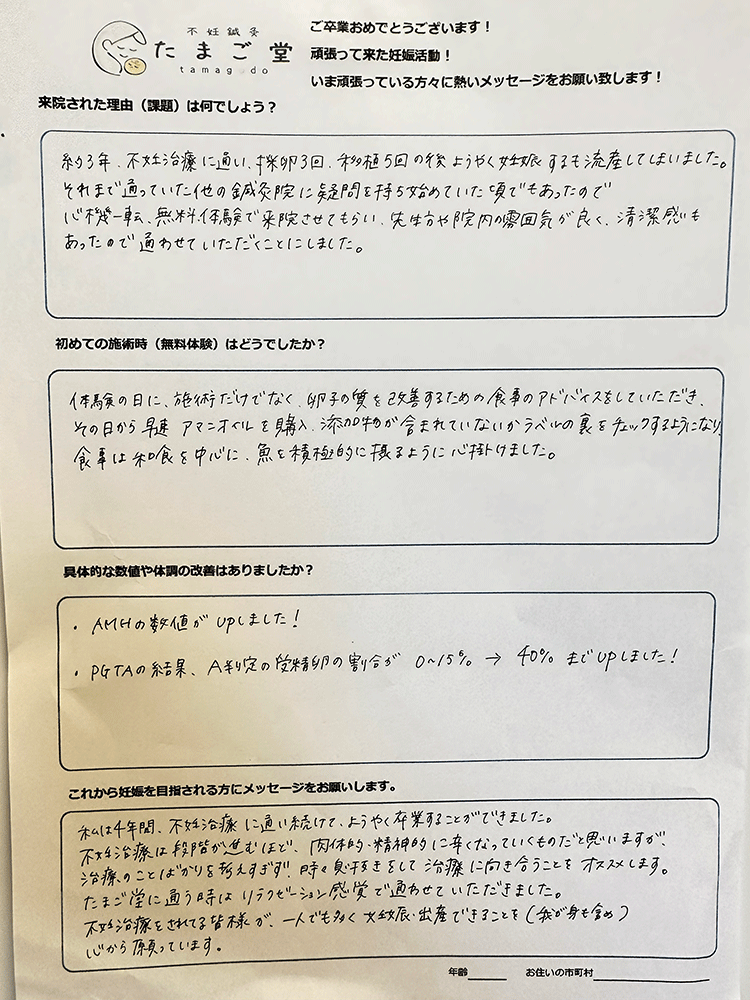 AMHは最初の検査以来調べていないので、数値に変化があったかはわかりませんが、体外受精の採卵の際は、卵が17個(受精に使えたものは12個)とれました。そんなに採れるとは正直思っていなかったので、たまご堂さんに通ったからかなぁと感じています。また、今までずっと、手足がいつも冷たかったのですが、通うようになってから、手がいつもぽかぽかになったのには自分でもびっくりしました。