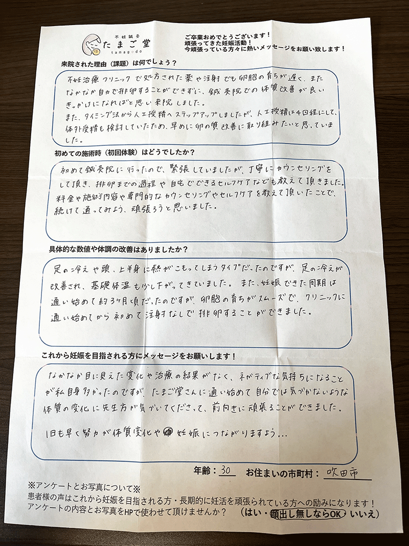でも、もともととても冷え症で便秘だったりと私の日頃の日常生活や体調の事を、院長先生は初めに書いたアンケートをもとに、1つ1つ丁寧に、原因と改善する為の方法を具体的に熱心に説明して下さいました。だから、私は『たまご堂』で院長先生を信じて、治療と体質改善を頑張ろうと思いました。