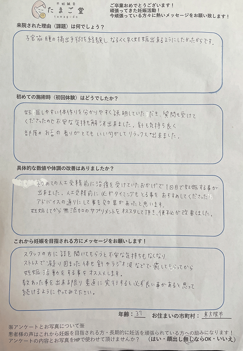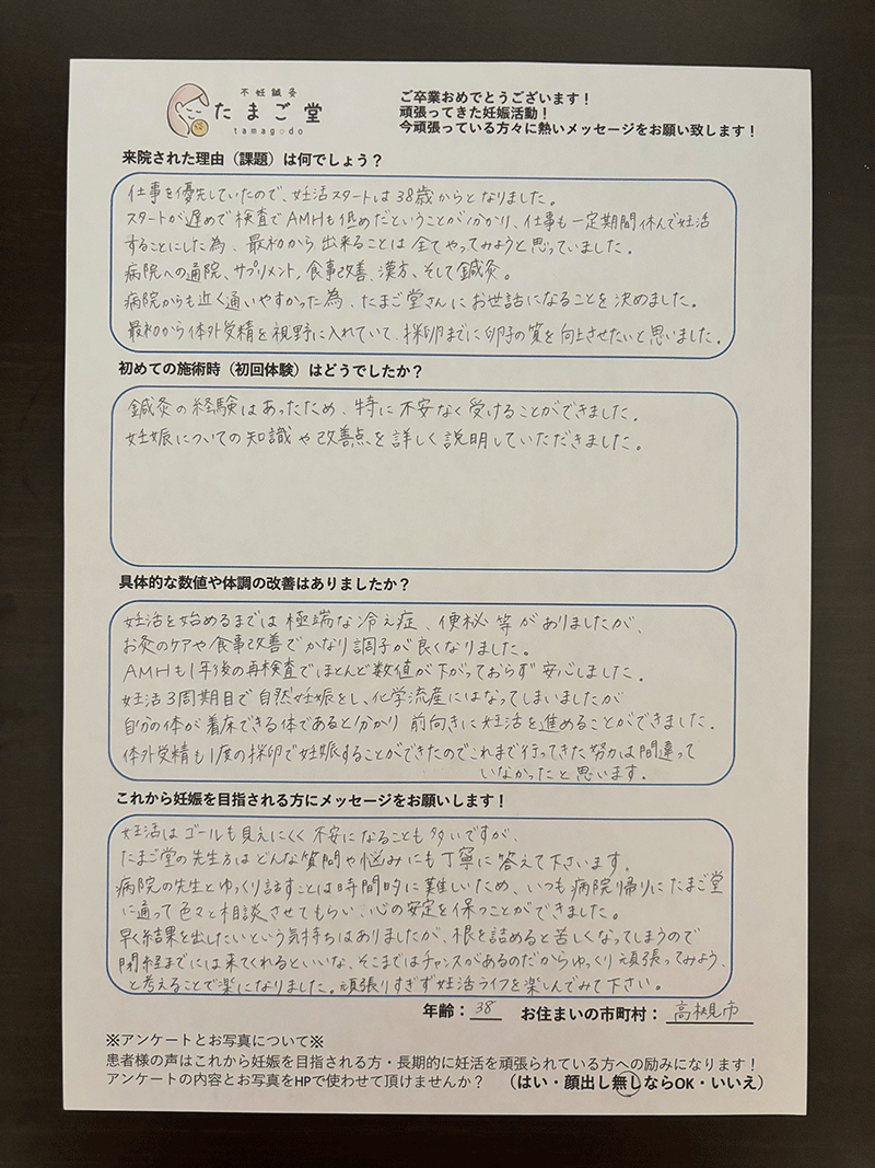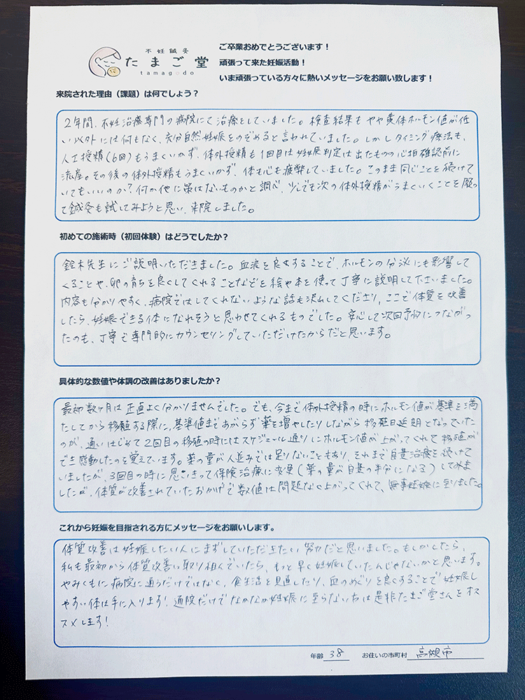 結婚して以来、夫の転勤が多くなかなか妊活に集中して取り組めないまま年月が過ぎ、年齢に焦りを感じてきた頃に、地元である大阪に異動になり、不妊治療を始めました。病院の検査でAMHの値が年齢相当より低かったこともあり、最短で妊娠するために、できることは全部やろう!!と夫と話し合い、たまご堂さんに通院することを決めました。