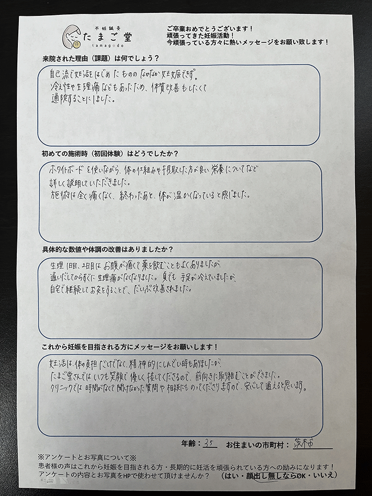 丁寧なカウンセリングで不妊治療専門クリニックだけではなく、たまご堂に通うことによって自分の身体が改善されるのではないかと思え、通うことにしました。