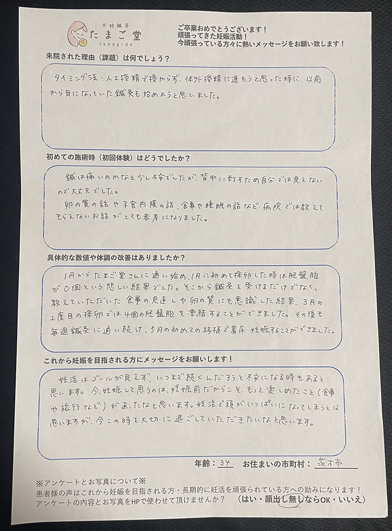 1月からたまご堂さんに通い始め、1月に初めて採卵した時は胚盤胞が0個という悲しい結果でした。そこから鍼灸を受けるだけではなく、教えていただいた食事の見直しや卵の質にも意識した結果、3月の2度目の採卵では4個の胚盤胞を凍結することができました。その後も毎週鍼灸に通い続け、5月の初めての移植で着床、妊娠することができました。