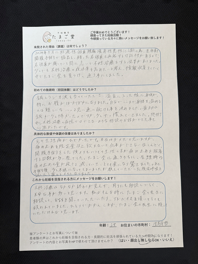 元々生理痛がひどかったです。本当はダメだと思いますが、痛み止めを規定量以上に飲まないと仕事ができないくらいしんどく、開腹手術をした後よりもいつもの生理の方が痛み止めを服薬する回数が多いほどでした。たまご堂に通ううちに、生理時の痛み止めの量が段々と減っていき、とても楽になり驚きました。